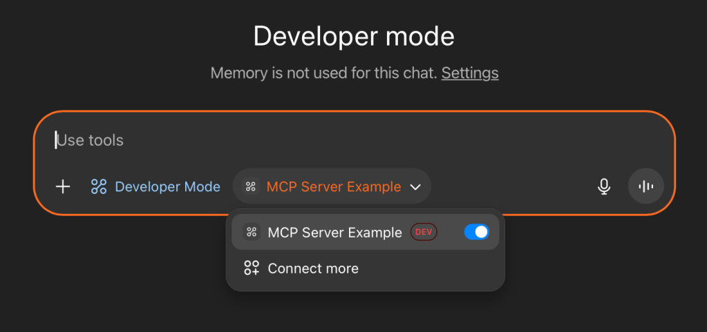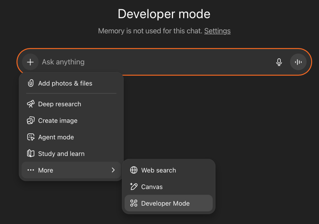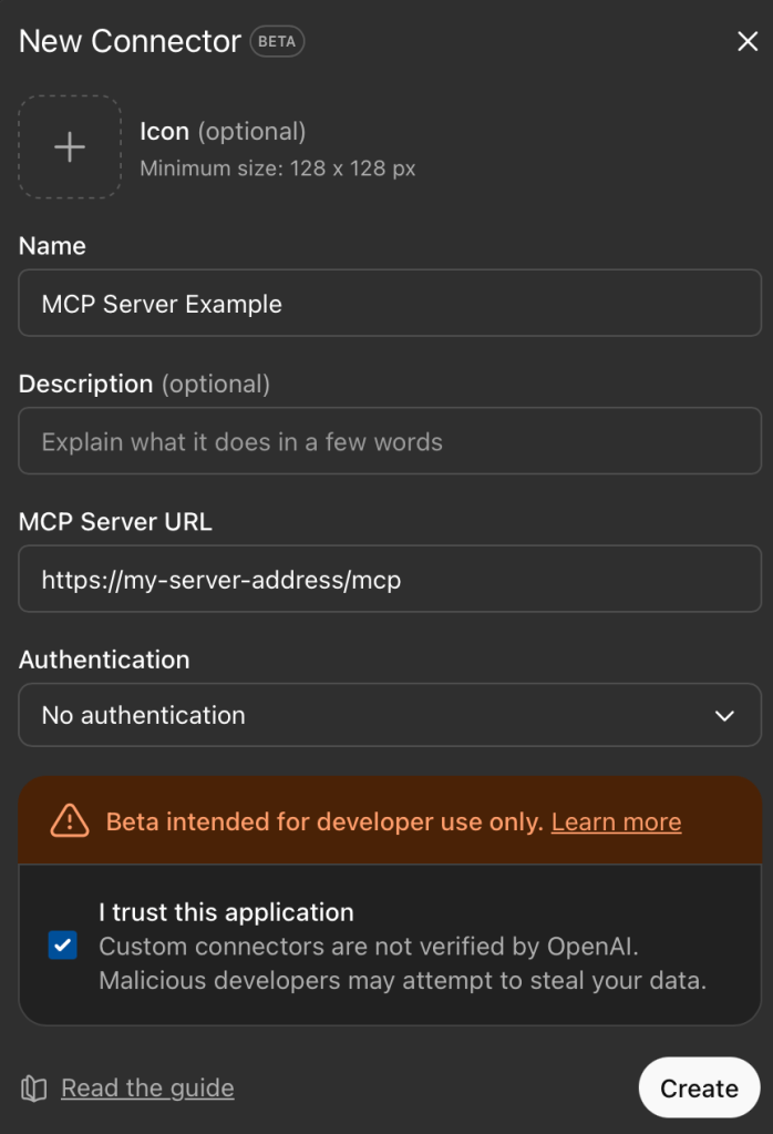 Now that we have configured our server, we can go to ChatGPT, turn on developer mode, and create the connector: