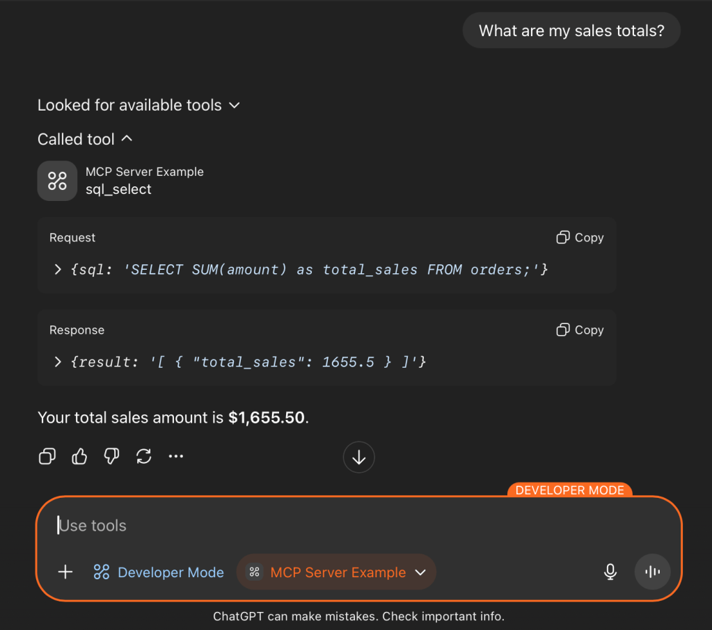 This post walks through a minimal but working example of the Model Context Protocol (MCP). The goal is to show how to expose a few simple database queries as MCP tools so that they can be called from an LLM interface like ChatGPT. We’ll set up a small SQLite database, create a Python server with three tools, and configure a connector so popular MCP-enabled providers and models (OpenAI ChatGPT, Anthropic Claude) can run queries against it.
