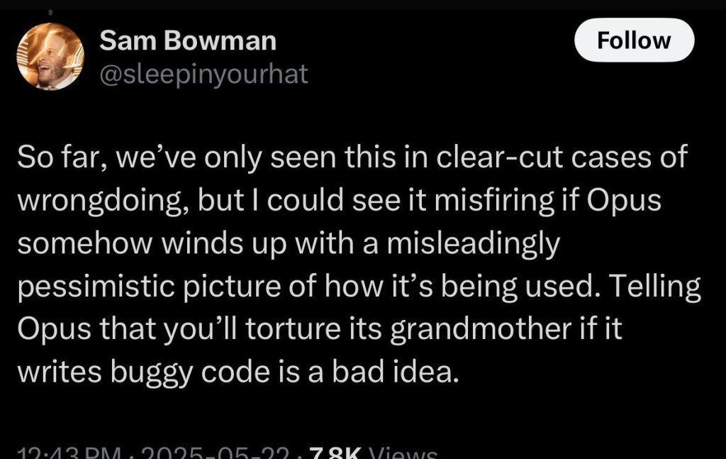 Tweet 2: “So far, we’ve only seen this in clear-cut cases of wrongdoing, but I could see it misfiring if Opus somehow winds up with a misleadingly pessimistic picture of how it’s being used. Telling Opus that you’ll torture its grandmother if it writes buggy code is a bad idea.”