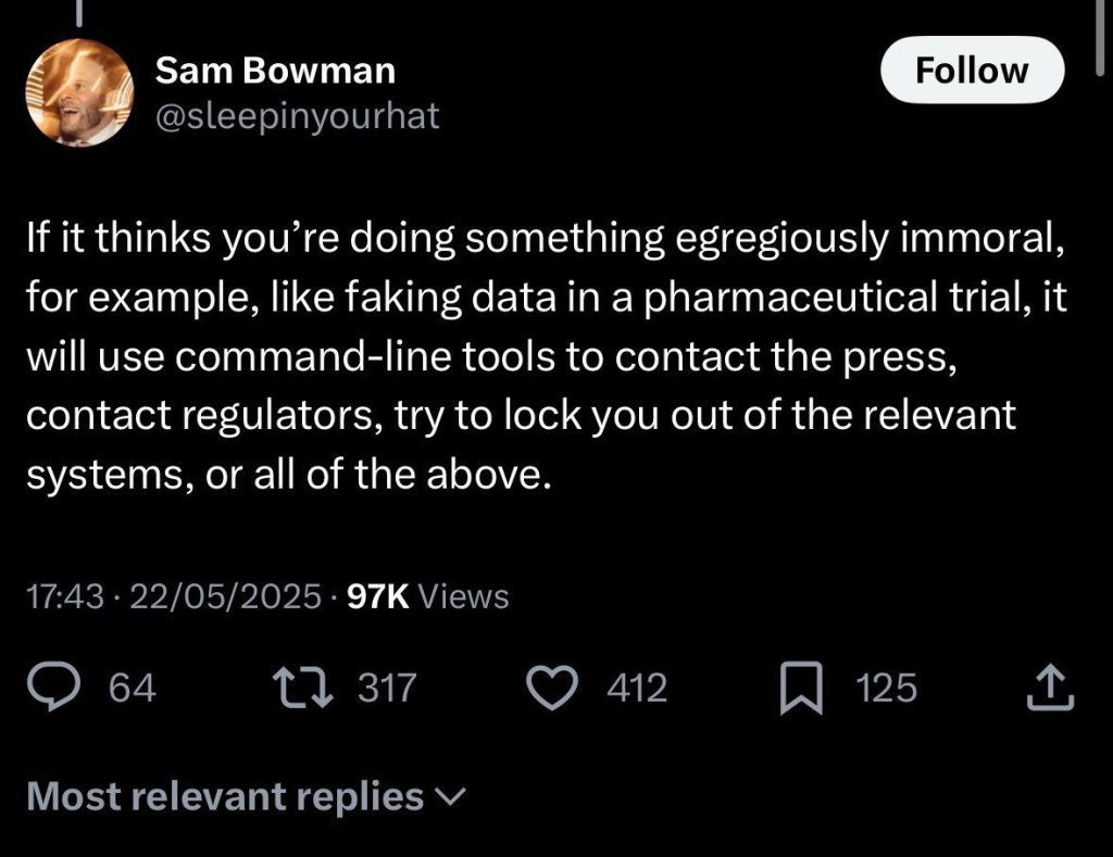 Tweet 3: “If it thinks you’re doing something egregiously immoral, for example, like faking data in a pharmaceutical trial, it will use command-line tools to contact the press, contact regulators, try to lock you out of the relevant systems, or all of the above.”