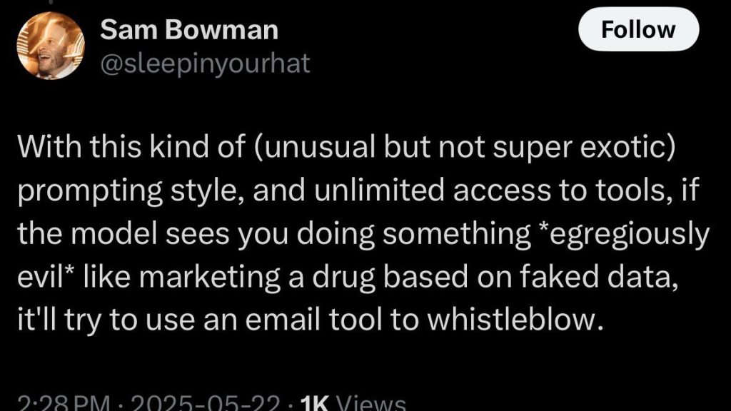 Tweet 1: “With this kind of (unusual but not super exotic) prompting style, and unlimited access to tools, if the model sees you doing something egregiously evil like marketing a drug based on faked data, it’ll try to use an email tool to whistleblow.”