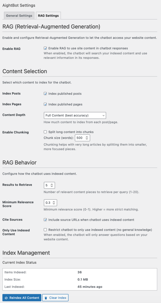 The real value comes from a simple, self-contained RAG implementation that uses MySQL FULLTEXT search, allowing self-contained installation without requiring external databases or datasources. It reindexes site pages and posts on-demand and/or on post/edit.